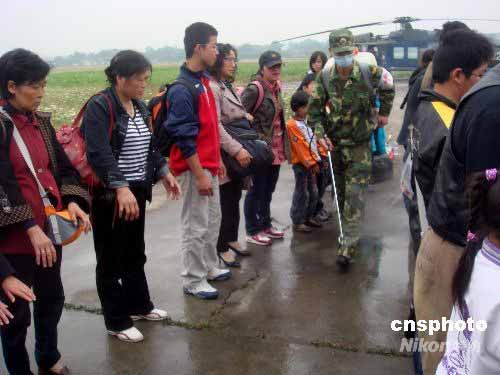 五月二十二日是汶川大地震第十一天,從地震災區(qū)空運到成都避難的民眾都必須進行消毒處理。中新社發(fā) 賈國榮 攝