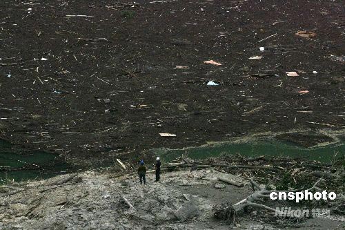 汶川大地震發(fā)生以后,水利地質(zhì)人員乘直升飛機(jī)降落到北川唐家山堰塞湖,檢測水位上漲和污染危情,嚴(yán)密監(jiān)測由于一座大山的崩塌堵塞河道形成的堰塞湖。中新社發(fā) 賈國榮 攝