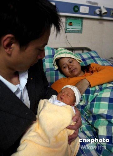 5月23日,李美川(右)和丈夫李應(yīng)剛在綿陽(yáng)市第三人民醫(yī)院細(xì)心照顧小寶寶李虹升。5月17日,孕婦李美川被武警官兵從地震重災(zāi)區(qū)北川縣漩坪鎮(zhèn)護(hù)送出來(lái)后順利分娩,母子現(xiàn)在一切安好。中新社發(fā) 黃榮 攝