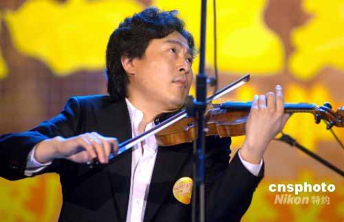 5月24日夜晚,北京民族文化宮大劇院隆重舉行《我們在一起——抗震救災大型配樂詩文朗誦義演》。圖為著名旅美小提琴家呂思清,激情演奏《思鄉(xiāng)曲》。此晚會是由中國廣播藝術(shù)團主辦、美中經(jīng)貿(mào)投資總商會會長、世界著名品牌大會等單位協(xié)辦的,會上為中國紅十字會募集賑災資金267.6萬元人民幣。中新社發(fā) 鄒憲 攝