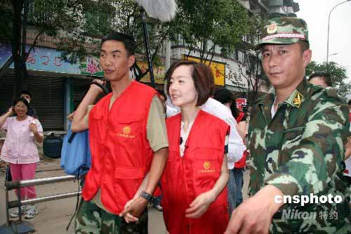 5月24日,鳳凰衛(wèi)視著名主持人陳魯豫深入地震災區(qū)四川綿竹漢旺鎮(zhèn)進行采訪。中新社發(fā) 黃家明 攝