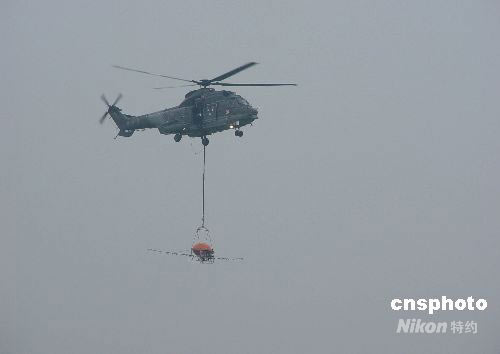 5月25日下午,香港特區(qū)政府飛行服務(wù)隊(duì)的“超級美洲豹”開始對外掛噴灑系統(tǒng)進(jìn)行安裝并試車。外掛噴灑系統(tǒng)是一個(gè)米黃色球體,內(nèi)裝900公升液體,懸掛在飛機(jī)下部200米處,工作人員在空中通過操作盤控制外掛噴酒系統(tǒng)指令開起閥門,將液態(tài)藥物灑下!俺壝乐薇边m用山地飛行,在地形復(fù)雜、山勢險(xiǎn)惡的四川地震災(zāi)區(qū)將發(fā)揮其重大作用。中新社發(fā) 張鈺昱 攝