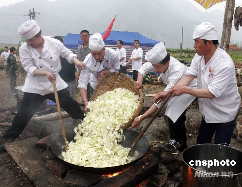 2008年5月25日下午6時(shí),四川彭州市小魚洞鎮(zhèn)大南村田地上,來(lái)自北京的大廚們?cè)跒楫?dāng)?shù)卮迕褡觥百c災(zāi)飯”。24日開始,北京美食聯(lián)盟組織北京全聚德、大鴨梨、便宜坊等大飯店的105名廚師,籌集200萬(wàn)元資金在災(zāi)區(qū)分設(shè)3個(gè)賑災(zāi)點(diǎn),免費(fèi)為災(zāi)區(qū)群眾供應(yīng)飯菜。中新社發(fā) 張曉理 攝