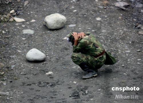 汶川大地震發(fā)生十五天以來余震不斷,一位搶險的士兵突遇滑坡,果斷蹲地減少人體面積,同時用雙手牢牢保護頭部,終于化險為夷。中新社發(fā) 賈國榮 攝