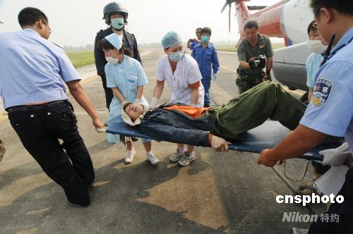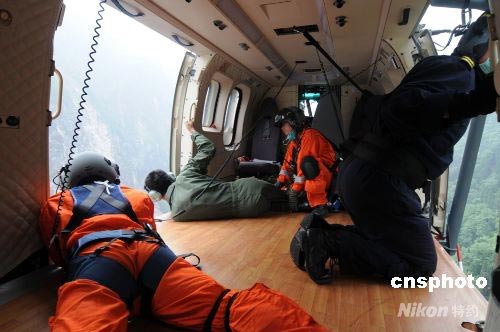干溝電站地勢險峻,四周高山環(huán)繞,由于塌方嚴重,亂石堆砌,惡劣的環(huán)境給救助直升機實施救助帶來極大的困難。直升機離最近的懸崖不到5米。機長李嘉只能將直升機從200米高空緩緩地一點點往下降,最后穩(wěn)穩(wěn)地懸停在30米高空。B-7125救助直升機立即進入救助模式,絞車手迅速拉開機艙,救生員緊握著鋼纜,躍出艙門,從30米的空中降下。此時,被困16天的4名被困人員從山溝里爬到救援點,救生員李春林迅速用救援套將一位傷員套好,然后頂著直升機旋翼產(chǎn)生的大風,抓緊鋼纜,又空中搖晃了十幾圈,終于把第一位傷員救上直升機。緊接著,另一位救生員楊建輝也降落在地面上,他用救援套將兩名傷員一起救上直升機。隨后,楊建輝再次躍出機艙,迅速來到重傷員尚征林身邊。楊建輝用盡全身力氣把他套好,然后緊抱著他,抓緊鋼纜,一起被拉上直升機。經(jīng)過10多分鐘的緊急救援,4名傷員都成功救上直升機。