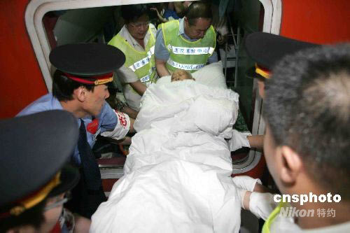 5月28日,首批91位四川災(zāi)區(qū)傷員抵達(dá)北京接受治療,這批傷員分別來自地震災(zāi)區(qū)的綿陽和德陽,其中15歲以下的12人,70歲以上的3人。傷員病情基本穩(wěn)定,傷情主要為四肢骨折等肢體外傷。傷員乘專列從綿陽火車站抵達(dá)北京,到京后他們被送往北京老年醫(yī)院治療。中新社發(fā) 富田 攝