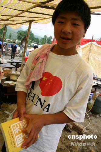 5月28日,在四川汶川大地震重災(zāi)區(qū)之一的彭州,尚未復(fù)課的小魚洞小學(xué)學(xué)生楊青科,拿著一本《陽(yáng)光心態(tài)》的書翻看,樂(lè)觀面對(duì)震后生活。中新社發(fā) 楊杰 攝