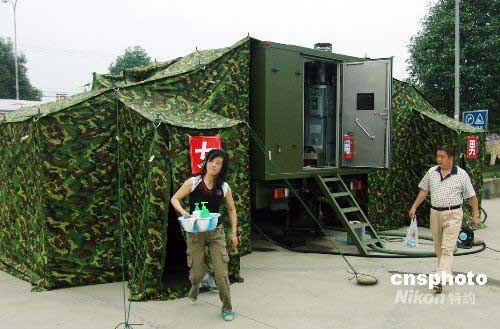 圖:濟(jì)南軍區(qū)野戰(zhàn)淋浴車開進(jìn)都江堰災(zāi)區(qū)