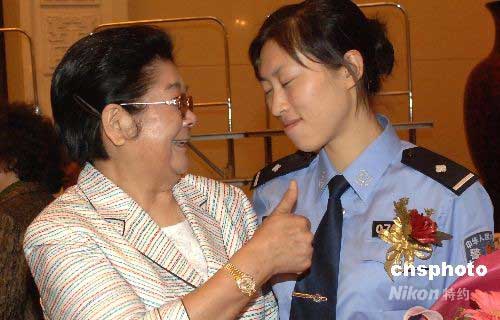 5月29日,全國(guó)婦聯(lián)主席顧秀蓮,在北京人民大會(huì)堂出席“第十四屆宋慶齡樟樹(shù)獎(jiǎng)?lì)C獎(jiǎng)典禮”時(shí),與28歲的羌族女民警,第十四屆宋慶齡樟樹(shù)獎(jiǎng)特別獎(jiǎng)獲得者--蔣敏交談,并勉力她勇敢地生活下去。在地震中,蔣敏的父母、女兒、奶奶、外婆,全家十口人離開(kāi)人世。但她毅然放棄回北川尋找親人機(jī)會(huì),連續(xù)工作五晝夜,因勞累過(guò)度,多次昏倒在搶險(xiǎn)救援現(xiàn)場(chǎng),被百姓譽(yù)為“最堅(jiān)強(qiáng)的警花”。日前,公安部授予她全國(guó)公安系統(tǒng)一級(jí)英雄模范稱號(hào)。1985年6月,總部在上海的中國(guó)福利會(huì)設(shè)立了宋慶齡樟樹(shù)獎(jiǎng),以此表彰為婦女兒童事業(yè)做出卓越貢獻(xiàn)的人士。中新社發(fā) 鄒憲 攝