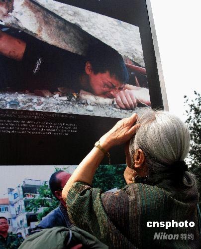 5月31日,北京王府井新華書店前,一名老人仔細觀看百名攝影家抗震救災攝影展,一名四川省北川羌族自治縣的男子被壓在廢墟下等待救援的圖片,深深震撼了老人。此圖片是新京報記者郭鐵流5月15日在四川北川拍攝的。中新社發(fā) 鄒憲 攝