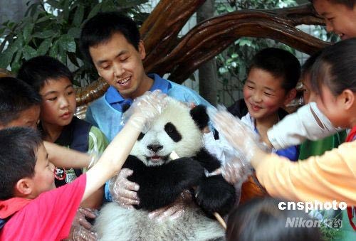 5月31日,成都市大熊貓繁育研究基地迎來(lái)了一群洋溢著快樂笑容的孩子,他們是彭州市龍門山鎮(zhèn)九年制學(xué)校的80名災(zāi)區(qū)學(xué)生。孩子們興致勃勃地參觀了熊貓基地并和熊貓寶寶星雅進(jìn)行了親密接觸。中新社發(fā) 黃榮 攝