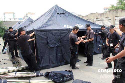 6月1日,經(jīng)過53小時日夜兼程到達四川綿陽集結(jié)地的福州市公安局特警支隊民警們迅速搭建宿營地,為開使執(zhí)勤做好準備。中新社發(fā) 常剛 攝