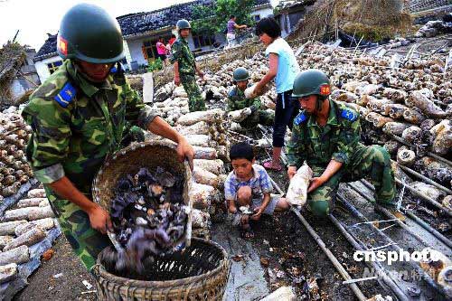 六月三日,空降兵士兵在四川什邡幫助百姓搶收木耳。四川什邡是重要的木耳生產(chǎn)基地,地震中損失慘重。五月十二日發(fā)生地震后八小時(shí)即空降至該地的空降兵部隊(duì),目前正開展幫助民眾重建家園工作,兩天內(nèi)他們已幫助農(nóng)民搶收木耳九千多公斤,以盡力減少地震帶來(lái)的經(jīng)濟(jì)損失。中新社發(fā) 慎重 攝