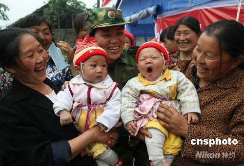 6月4日,在地震中受到傷害的平武縣石坎鄉(xiāng)五個月大的雙胞胎兄弟李杰、李彬,經(jīng)過濟(jì)南軍區(qū)第159醫(yī)院野戰(zhàn)醫(yī)療隊軍醫(yī)的精心呵護(hù),恢復(fù)了健康。在受困群眾救助站,雙胞胎兄弟成為一對耀眼的“小明星”。中新社發(fā) 畢華明 攝