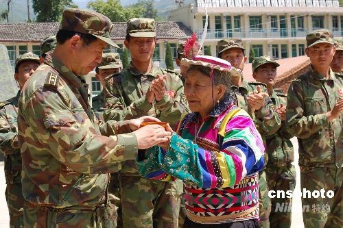 6月4日上午,四川平武縣木皮藏族鄉(xiāng)金豐村70余名藏族群眾,簇?fù)碇鴦倧目h人民醫(yī)院康復(fù)出院的79歲的木會(huì)真老大娘,來(lái)到濟(jì)南軍區(qū)某紅軍團(tuán)駐點(diǎn),以敬蜂蜜酒、屈膝作輯的最高禮節(jié),感謝官兵獻(xiàn)血挽救了他們的生命。圖為79歲的藏族老大娘木會(huì)真為濟(jì)南軍區(qū)某紅軍團(tuán)政委裴曉昌敬蜂蜜酒。5月25日下午的余震,不僅把老大娘半山腰的房屋震塌,還把她埋在廢墟里。由于木會(huì)真的頭部被房梁砸出了8公分的口子,血流不止,加上年老體弱,生命垂危。濟(jì)南軍區(qū)某紅軍團(tuán)官兵及時(shí)營(yíng)救并為失血過(guò)多的老大娘獻(xiàn)血。中新社發(fā) 虞平 攝