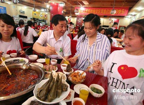 2008年6月8日,在汶川地震中受傷的傷員在重慶巴南區(qū)一火鍋店同當(dāng)?shù)厝嗣襻t(yī)院的醫(yī)護(hù)人員一道燙火鍋吃粽子,共度端午傳統(tǒng)佳節(jié)。中新社發(fā) 賀終榮 攝
