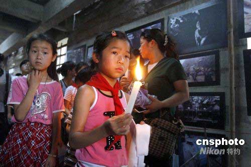 六月十二日,幾位孩子拿著蠟燭走進(jìn)四川成都的汶川大地震博物館。當(dāng)日,中國(guó)首家汶川大地震博物館在四川成都建成開館,近4000件地震文物,1000余幅地震現(xiàn)場(chǎng)的照片,1000余幅地震死難者的照片墻持續(xù)震撼著觀展者的視覺。展覽以日記的形式,展現(xiàn)出從5月12日地震第一天到6月12日以來(lái),每天發(fā)生的大事件。中新社發(fā) 慎重 攝