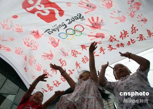 6月17日,距離北京奧運(yùn)會(huì)還有52天,北京奧林匹克社區(qū)的50多位市民聚集在一起,在印有奧運(yùn)會(huì)會(huì)徽的旗幟上印下自己的手印,共同迎接奧運(yùn)會(huì)倒計(jì)時(shí)50天。 中新社發(fā) 杜洋 攝
