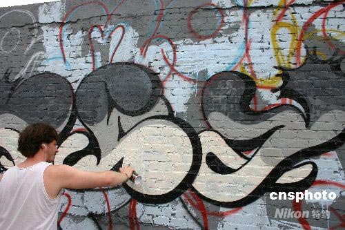 圖:年輕藝術(shù)家繪制奧運文化墻