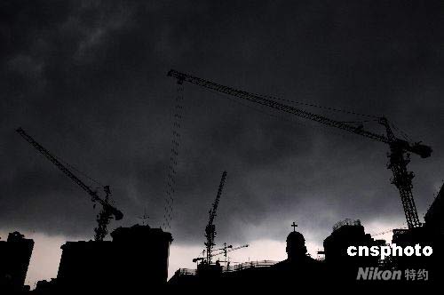 受2008年第七號臺風(fēng)“海鷗”的影響,7月18日下午4點(diǎn)30分左右,層層黑云籠罩廈門城區(qū)上空,晝夜難分,約10分鐘后,雷陣雨傾盆而下。據(jù)當(dāng)?shù)貧庀笈_消息,廈門受到臺風(fēng)外圍環(huán)流的影響,未來兩天可能出現(xiàn)中陣雨和雷陣雨,局部地區(qū)有大雨。中新社發(fā) 柳濤 攝