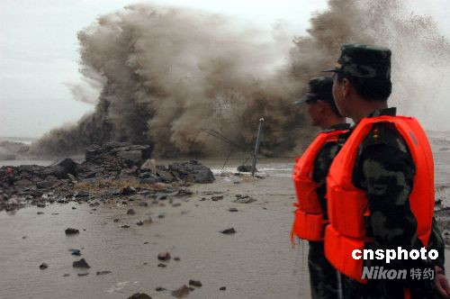 7月28日,洞頭邊防官兵在海邊巡邏,巨浪拍擊岸邊激起10多米高的浪花。當(dāng)日傍晚,受今年第8號臺風(fēng)“鳳凰”影響,浙江溫州市洞頭海域風(fēng)力大增,攔海大堤旁波濤洶涌,掀起巨浪達(dá)10多米高。洞頭邊防大隊迅速出動抗臺應(yīng)急分隊,加強(qiáng)海邊巡邏檢查,及時勸阻觀浪群眾撤離至安全地帶。中新社發(fā) 吳水斌 攝