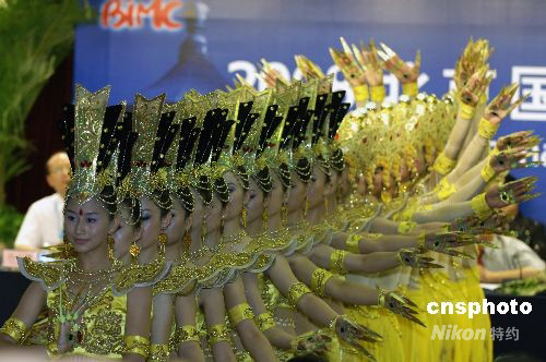 8月4日,中國殘疾人藝術(shù)團的演員在北京國際新聞中心向前來采訪奧運會的國內(nèi)外非注冊記者表演“千手觀音”。中新社發(fā) 王東明 攝
