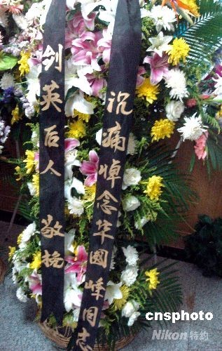 8月22日,解放軍305醫(yī)院設置悼念原中共中央主席華國鋒的靈堂,社會各界人士前往悼念。據(jù)悉,將從當天起進行3天的公眾悼念活動。華國鋒因病醫(yī)治無效于8月20日12時50分在北京逝世,享年87歲。圖為葉帥后人所送花圈。中新社發(fā) 韓凱 攝