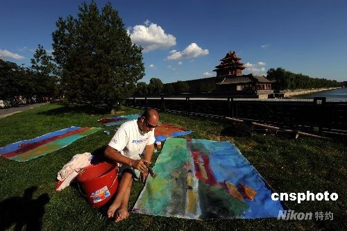 8月31日,北京天氣晴朗藍(lán)天中漂浮著朵朵白云,新加坡籍殘疾人Gregory Burns坐在故宮北門外的綠地上為藍(lán)天白云下的北京城作畫。中新社發(fā) 廖攀 攝