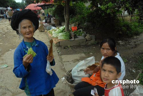 8月31日是四川攀西地震發(fā)生后的第二天,也是地震災區(qū)當?shù)剜l(xiāng)鎮(zhèn)趕集的日子。在距離震中約四十公里的地震災區(qū)大龍?zhí)多l(xiāng)村民照常趕集,購買日常用品。圖為當?shù)匕耸啐g的李姓老人帶著孫子、孫女到集市吃小吃。中新社發(fā) 保旭 攝