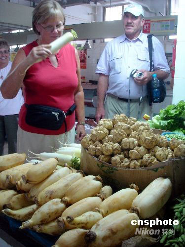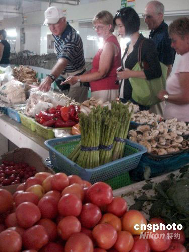 2008年9月1日,外國游人在蘇州雙塔菜場游覽。如今到蘇州旅游的外國游人越來越多,他們在游覽古典園林的同時,蘇州的菜市場也成為“老外”游客游覽的新景點。市場內豐富的農(nóng)產(chǎn)品和當?shù)匕傩丈钗恕袄贤狻眰兊哪抗狻V行律绨l(fā) 王建康 攝