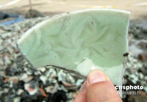 9月下旬,記者來(lái)到河下古鎮(zhèn)城河水道開(kāi)挖工地現(xiàn)場(chǎng),看到大量同種青瓷碎片裸露在距地表3米多深的河底,有一些已被挖掘機(jī)抓到地面臨時(shí)隔離起來(lái)。區(qū)有關(guān)部門已著手制訂考古方案,并對(duì)發(fā)掘現(xiàn)場(chǎng)落實(shí)了有效的保護(hù)措施。中新社發(fā) 李正林 攝