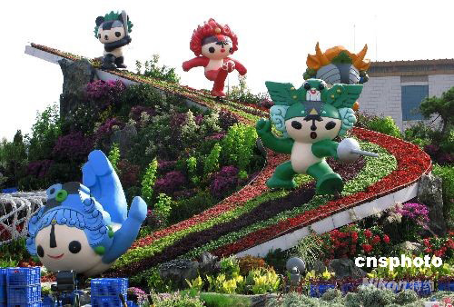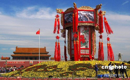 9月25日,北京天安門廣場“普天同慶”繁花錦簇的十一國慶花壇布置工程進(jìn)入了最后收尾階段。廣場東側(cè)的5個(gè)福娃花壇與中央9.9米高的民族傳統(tǒng)宮燈花壇相映成趣。中新社發(fā) 鄒憲 攝