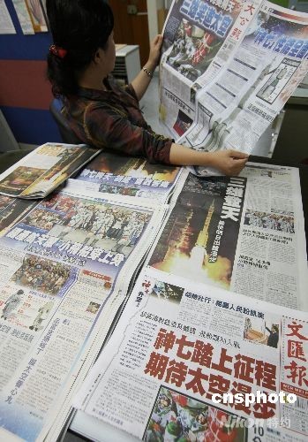 九月二十六日,香港各大報(bào)章都以“神舟七號”成功發(fā)射為頭條,祝賀飛船發(fā)射圓滿成功。中新社發(fā) 武仲林 攝
