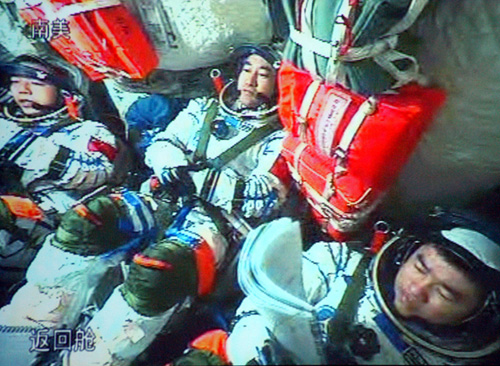 圖:神舟七號返回在即航天員穿好艙內(nèi)服