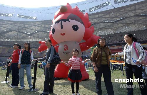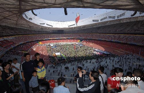 9月30日,“十一”國慶長假第二天,旅游黃金周進入高潮,到北京旅游的各地游客都渴望進入北京奧運會主體育場“鳥巢”,有幸購到參觀票的游客在鳥巢盡情玩耍拍照。 中新社發(fā) 鄒憲 攝