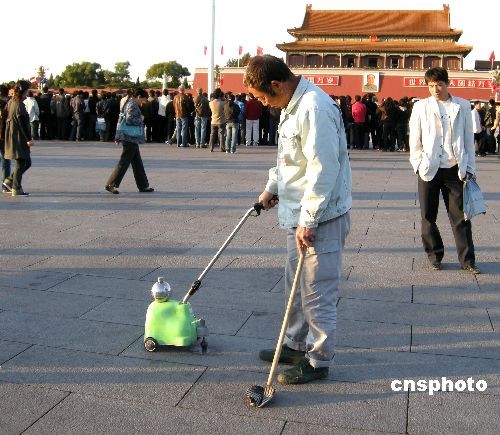 2008年10月26日,一種專門清理口香糖的袖珍電動清潔機亮相北京天安門廣場。圖為環(huán)衛(wèi)工人使用它清洗大理石上的口香糖。中新社發(fā) 玉龍 攝