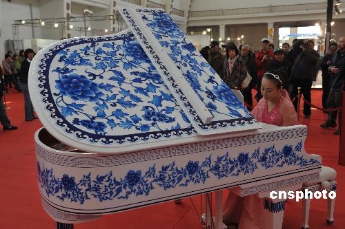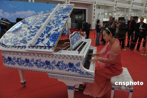 10月28日,在中國(guó)東北亞(沈陽(yáng))進(jìn)口商品博覽會(huì)上,一名少女在彈奏青花瓷鋼琴,F(xiàn)場(chǎng)的工作人員介紹說(shuō),這架名為琴瓷的鋼琴是專門為前不久舉辦的國(guó)際樂(lè)器展覽會(huì)制作的,琴身上的瓷紋是由技術(shù)人員手工雕刻而成,目前在世界上僅有這一架,市場(chǎng)售價(jià)在46.9萬(wàn)元左右。中新社發(fā) 徐建國(guó) 攝