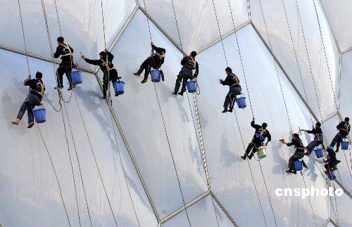11月7日,清潔工人對(duì)“水立方”室外膜結(jié)構(gòu)進(jìn)行清洗。國家游泳中心有限責(zé)任公司相關(guān)負(fù)責(zé)人表示,這是奧運(yùn)會(huì)后水立方首次全身“洗澡”。此次清洗主要是因?yàn)楸本┤肭锖罂諝庵袎m土較多,專業(yè)的保潔人員只是幫助水立方擦去外層附著的塵土。所以,清洗時(shí)并不需要特殊的清洗液,只要清水即可。而水立方內(nèi)部膜結(jié)構(gòu)此次并不需要清潔。中新社發(fā) 吳芒子 攝
