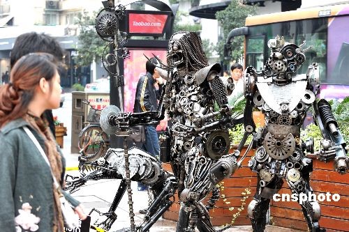 11月8日,由裝置藝術(shù)家周峰先生創(chuàng)作的九件“汽車零件機(jī)器人”在浙江杭州西湖創(chuàng)意市集上首次集中展示,嶄新的藝術(shù)創(chuàng)作形式吸引了眾多的眼球。據(jù)了解,近年來,作者大量收集汽車、摩托車上的廢舊金屬零件進(jìn)行焊接組合,創(chuàng)作了無敵戰(zhàn)士、恐龍、眼鏡蛇等一批風(fēng)格獨(dú)特的“機(jī)器人”。中新社發(fā) 李忠1 攝