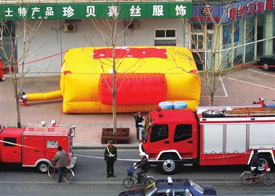 事發(fā)兩廣路與祈年大街路口西南角的珍貝大廈樓頂。記者9點多趕到時,消防員已在樓下充起氣墊,四周都拉起警戒線,有民警及交警疏散圍觀群眾。該樓高6層,樓頂立有4個一米高的漢字招牌,兩名中年女子就扶著鐵架,面對面騎坐在“大”、“廈”兩個招牌的旁邊,此時,兩人已在此坐了近兩個小時。據(jù)知情人透露,這兩名女子一名叫郭麗娜,吉林人,一名叫于秀敏,山東人,因錢在北京被搶而想不開,二人于近日認識。一名大廈的工作人員稱,頂層的大門一直是鎖著的,不知道這兩名女子如何爬到那個地方。由于二人脖子上均拴著繩子,如果墜下很可能發(fā)生危險,且她們所處的位置有障礙物阻擋,給民警的救援工作帶來困難。