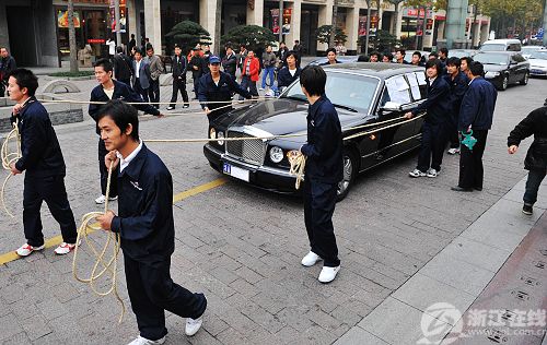17日,杭州,20多人拉著一輛價(jià)值500多萬(wàn)的高檔豪華轎車,在西湖邊向路人展示這輛豪華轎車的名不副實(shí)。