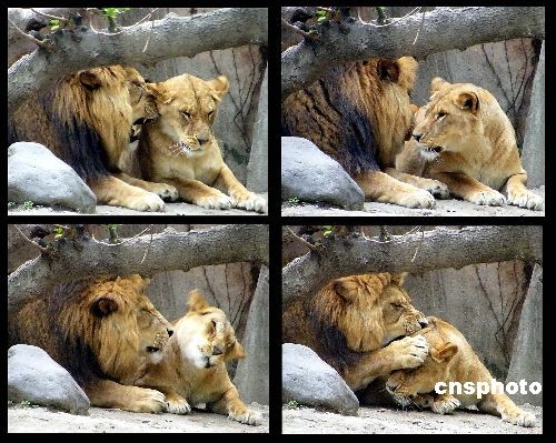 2008年11月18日,上海動(dòng)物園內(nèi)的兩只獅子在互相依偎取暖。一股較強(qiáng)冷空氣正在氣勢(shì)洶洶南下,17日開始影響申城。來自上海氣象部門的消息,這股冷空氣將給申城帶來明顯大風(fēng)降溫,過程降溫幅度6-8℃,19日和20日早晨最低氣溫將跌至5℃左右,有霜或暗霜。中新社發(fā) 井韋 攝