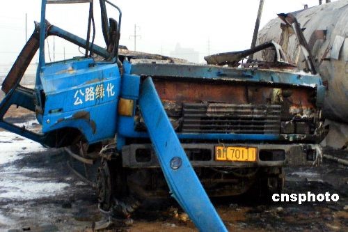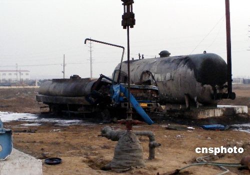 2008年12月16日,山東濱州,一盜竊原油的大罐車(chē)前端被炸開(kāi),駕駛室被炸飛,四周散落著汽車(chē)殘骸,現(xiàn)場(chǎng)沒(méi)有發(fā)現(xiàn)傷亡人員。據(jù)現(xiàn)場(chǎng)附近保安講,當(dāng)天凌晨5時(shí),一陣巨大爆炸聲突響,他們走出廠區(qū)才知道是附近油井方向起火爆炸,隨后又接連傳來(lái)兩次爆炸聲。濱州消防出動(dòng)三輛消防車(chē),迅速將大火撲滅。據(jù)警方透露,盜油者在盜油時(shí),產(chǎn)生電火花引發(fā)汽車(chē)起火,爆炸后棄車(chē)逃跑,盜油車(chē)和儲(chǔ)油罐相距1米,幸虧消防官兵及時(shí)撲救,避免了一場(chǎng)更大災(zāi)難發(fā)生。中新社發(fā) 唐劍 梁效 攝