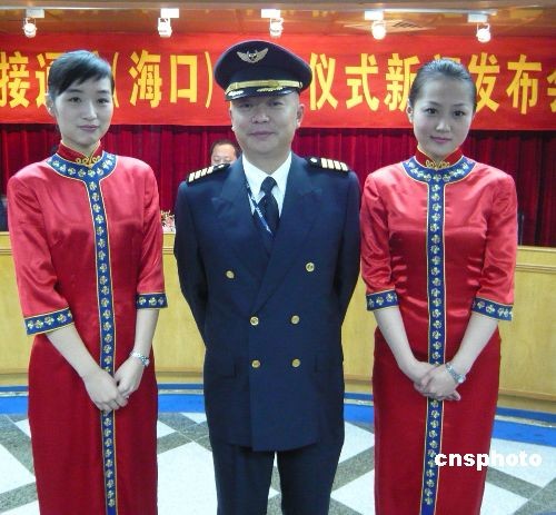 十二月二十日,?-臺北將首開直航航線。海南航空為順利完成此次首航,特別推出精干的機組人員。機長蒲明(中)曾執(zhí)飛2005年兩岸春節(jié)包機最后一個航班。乘務(wù)長和頭等艙乘務(wù)員在去年以來都曾執(zhí)飛過兩岸中秋、春節(jié)包機。中新社發(fā) 王辛莉 攝
