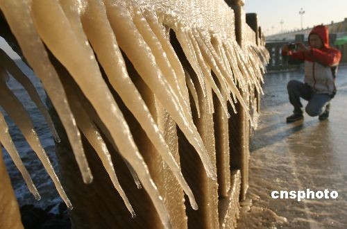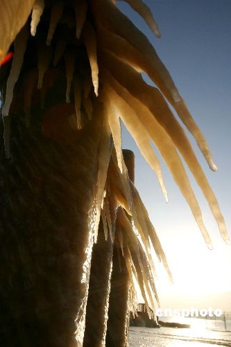 12月22日,受寒潮影響,江蘇連云港出現(xiàn)大風降溫天氣,最低氣溫零下8攝氏度。在偏北大風作用下,海上生成巨浪,濺在海岸邊護欄上的海水凍結成晶瑩剔透的冰凌。當?shù)貧庀蟛块T發(fā)布黃色寒潮預警,同時發(fā)出大風警報。中新社發(fā) 王健民 攝