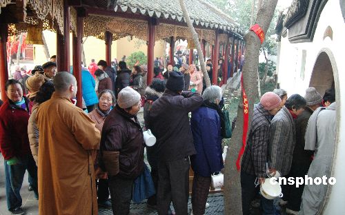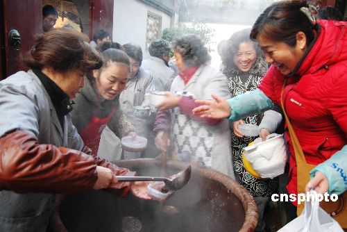 2009年1月3日,是中國傳統(tǒng)的“臘八節(jié)”,在中國民間有吃“臘八粥”的習(xí)俗。蘇州寒山寺向進(jìn)寺的市民免費(fèi)派送“臘八粥”,已成傳統(tǒng)。據(jù)悉,寒山寺當(dāng)日向市民提供“臘八粥”3800余公斤。中新社發(fā) 朱子寒 攝
