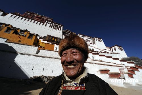 一月十九日,西藏立法機構通過一項議案,決定把每年三月二十八日設為西藏“百萬農(nóng)奴解放紀念日”,以紀念五十年前在西藏進行的民主改革。圖為拉薩布達拉宮雪城前,現(xiàn)年七十三歲的昔日農(nóng)奴益西洛追得知此訊表示非常高興。中新社發(fā) 廖攀 攝