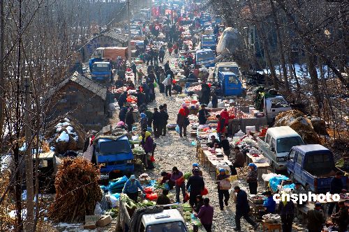 進(jìn)入農(nóng)歷臘月,中國山東一些農(nóng)村集市逐步紅火,特別是春節(jié)臨近,山村集市上車水馬龍,一派“清明上河圖”景象。中新社發(fā) 宋吉河 攝
