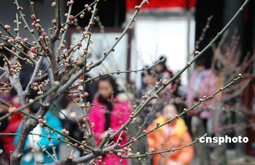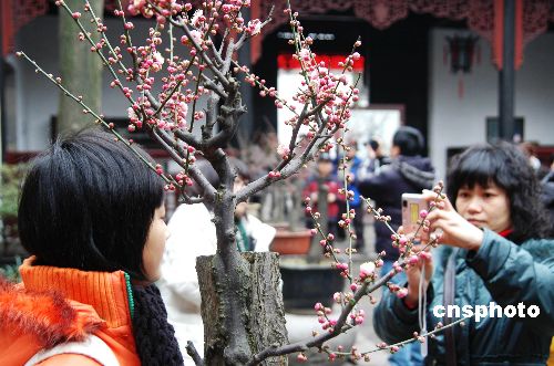 2009年1月20日,蘇州園林“迎春梅花展”在獅子林內(nèi)開幕,百余件造型各異的紅、綠、雪梅和劈梅老樁盆景,吸引許多觀眾。中新社發(fā) 朱子寒 攝