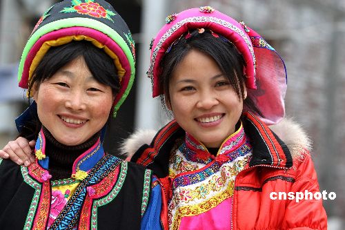 1月26日農(nóng)歷牛年第一天,5·12地震重災(zāi)區(qū)四川省北川縣擂鼓鎮(zhèn)羌族女中學(xué)英語教師謝紅霞(左)穿上民族節(jié)日盛裝到各個(gè)羌族村寨看望她的學(xué)生和家長。去年地震發(fā)生時(shí),謝紅霞與全體教師沉著鎮(zhèn)靜地將所有學(xué)生保護(hù)到安全地帶,學(xué)生與家長們由衷地感謝這些教師。中新社發(fā) 任晨鳴 攝